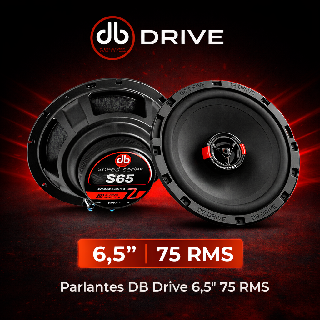 Parlantes DB Drive de 6,5 pulgadas con 75 RMS, ideales para mejorar potencia y claridad en el audio del vehículo.