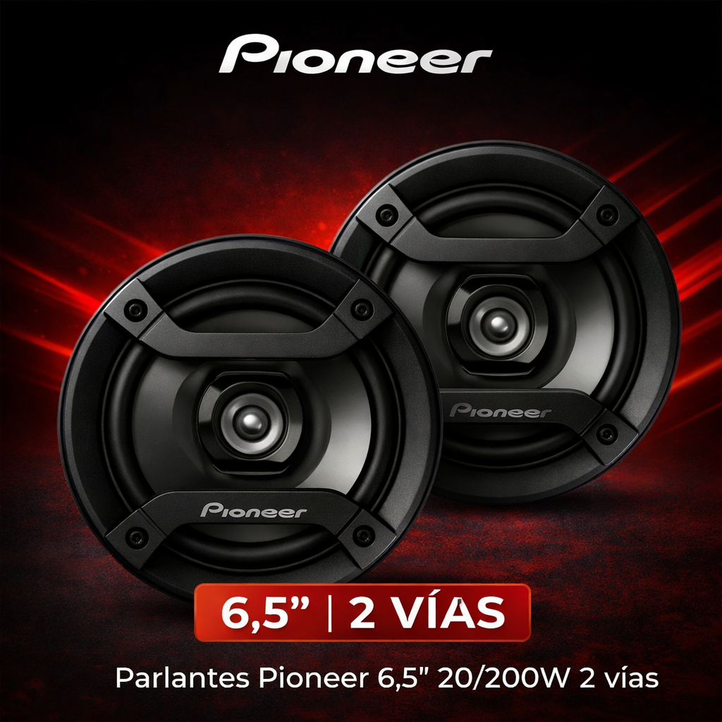 Parlantes Pioneer de 6,5 pulgadas de 2 vías, diseñados para ofrecer un sonido equilibrado con buena presencia de bajos y agudos. Ideales para mejorar el sistema de audio original del vehículo.